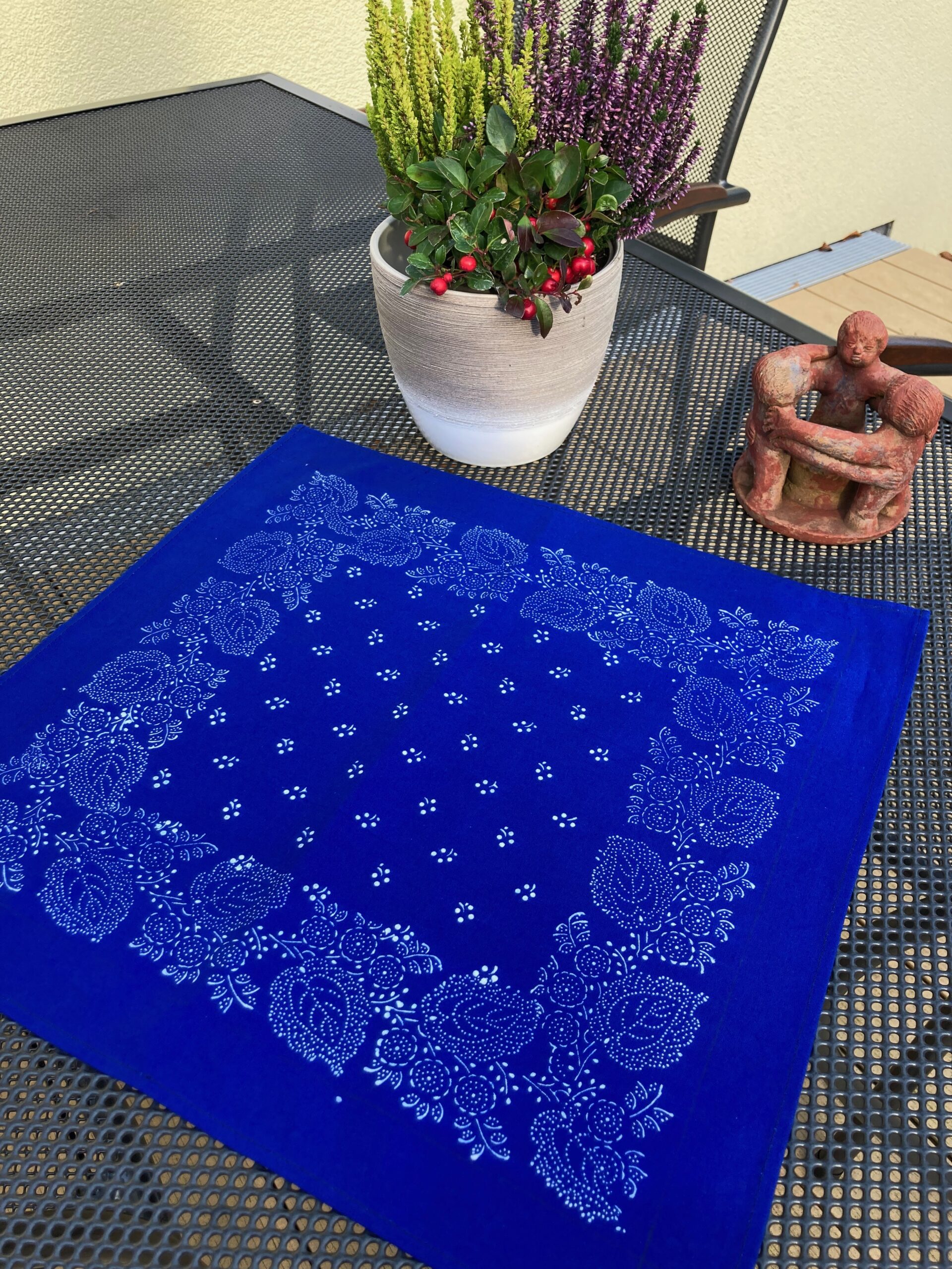 Blaudruck – Deckchen mit einfacher Bordüre und flächigem Mittelmotiv. Schöner mittlerer Blauton.