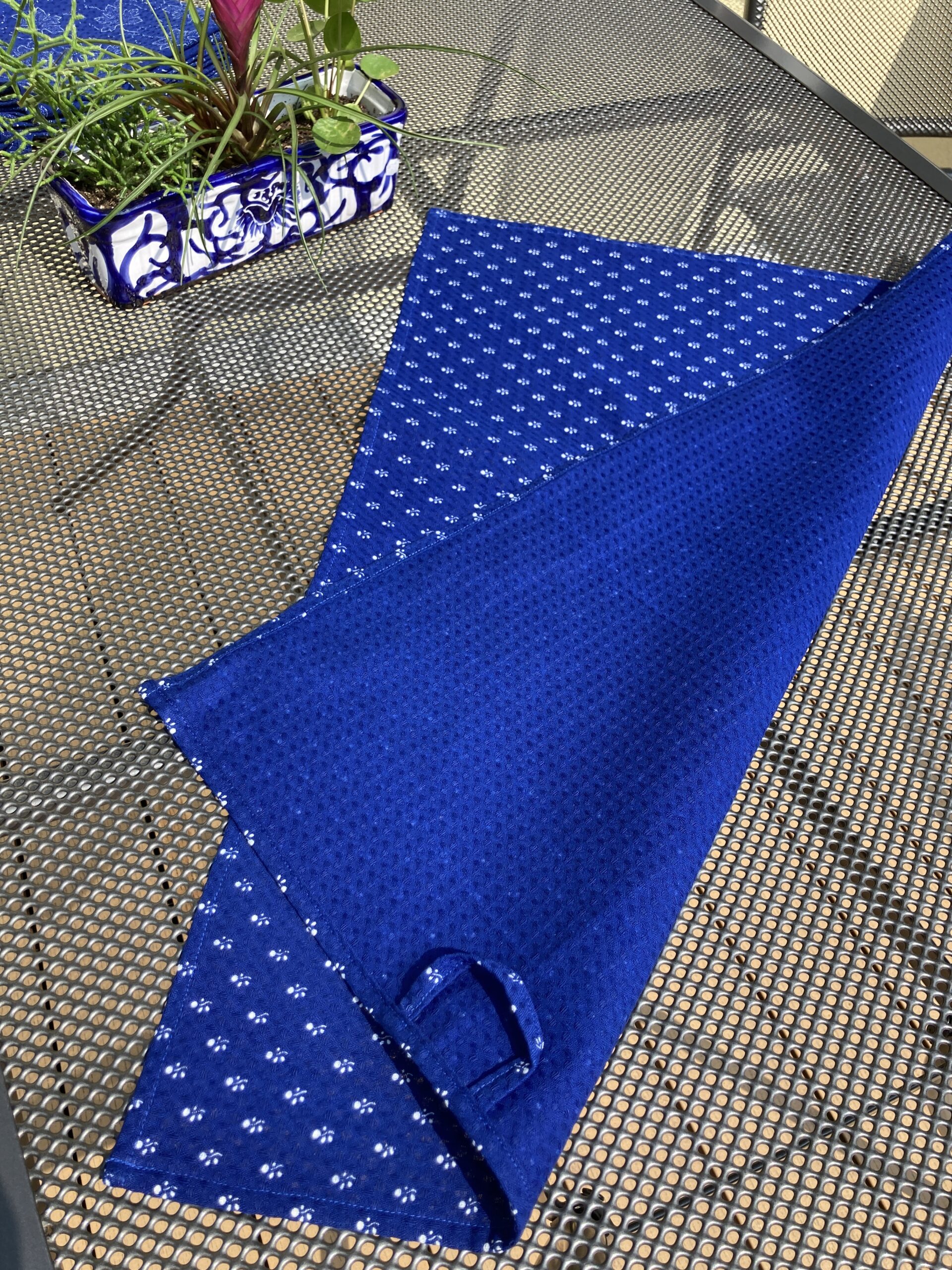 Blaudruck-Geschirrtuch aus Baumwolle, Waffelpique. Die Geschirrtücher haben eine Größe von 0,53 x 0,70m. Auf der Rückseite ist ein Aufhänger angenäht. Die Rückseite ist uni blau. Es ist ein schöner Blauton.