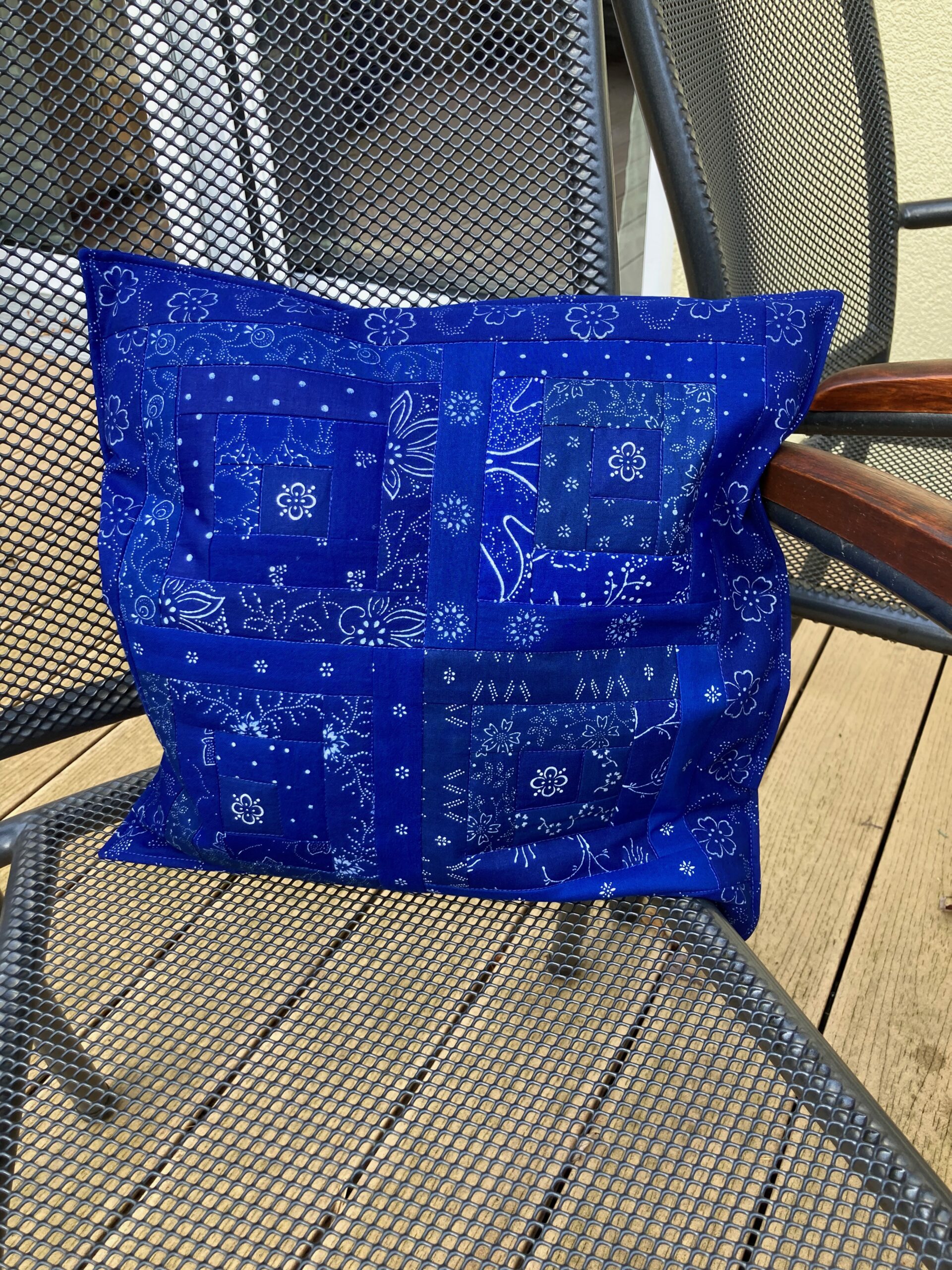 Blaudruck – Kissenbezug, in Handarbeit gefertigt, Größe des Kissens ca. 41 x 41 cm, schmalkantig abgesteppt auf ca. 40 x 40 cm. Der Kissenbezug ist aus einem Blaudruckstoff, Rand der Vorderseite und die Rückseite, und im Mittelteil aus vier Log Cabin Quadraten genäht. Von links wurde ein leichtes Vlies eingenäht und die Vorderseite habe ich mit der Maschine gequiltet. Auf der Rückseite ist ein 35 cm langer Reißverschluss verdeckt eingenäht. Die Kissenfüllung ist nur für das Foto eingezogen worden. Versand ohne Füllung.