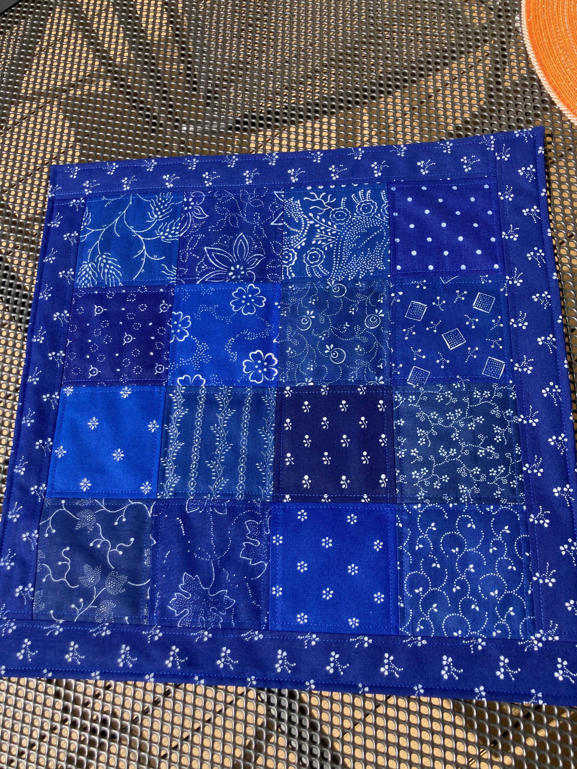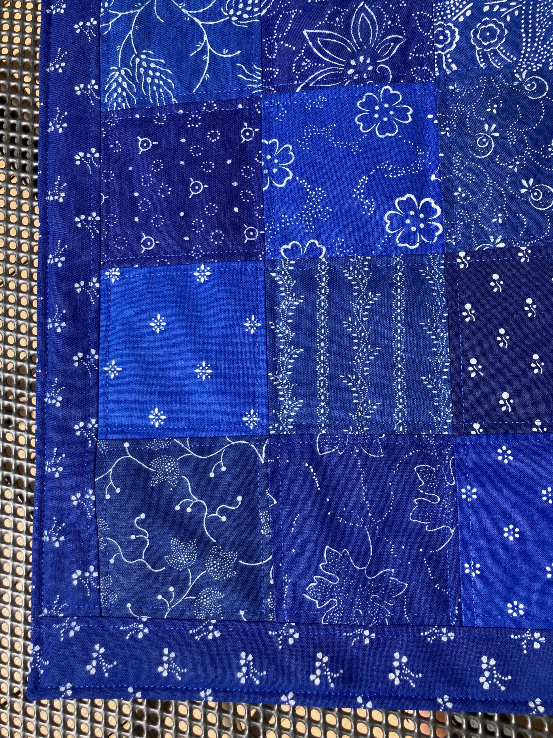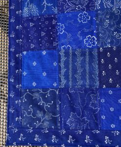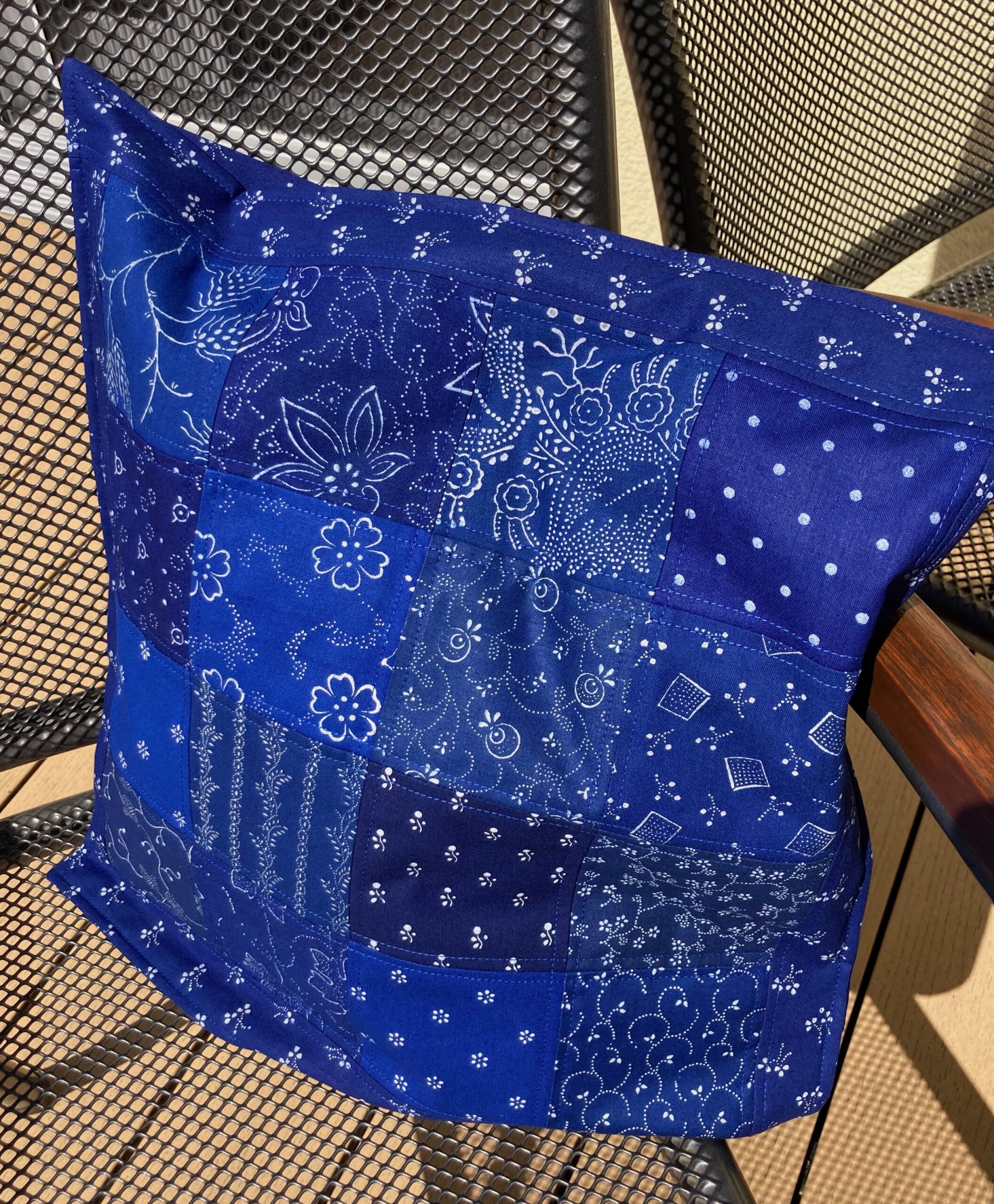 Blaudruck – Kissenbezug, in Handarbeit gefertigt, Größe des Kissens 40 x 40 cm. Der Kissenbezug ist aus 16 verschiedenen Blaudruckstoffen – Quadraten genäht. Von links wurde ein leichtes Vlies eingenäht und die Vorderseite jeweils rechts und links neben den Nähten gequiltet. Auf der Rückseite ist ein 35 cm langer Reißverschluss verdeckt eingenäht. Die Kissenfüllung ist nur für das Foto eingezogen worden. Versand ohne Füllung.