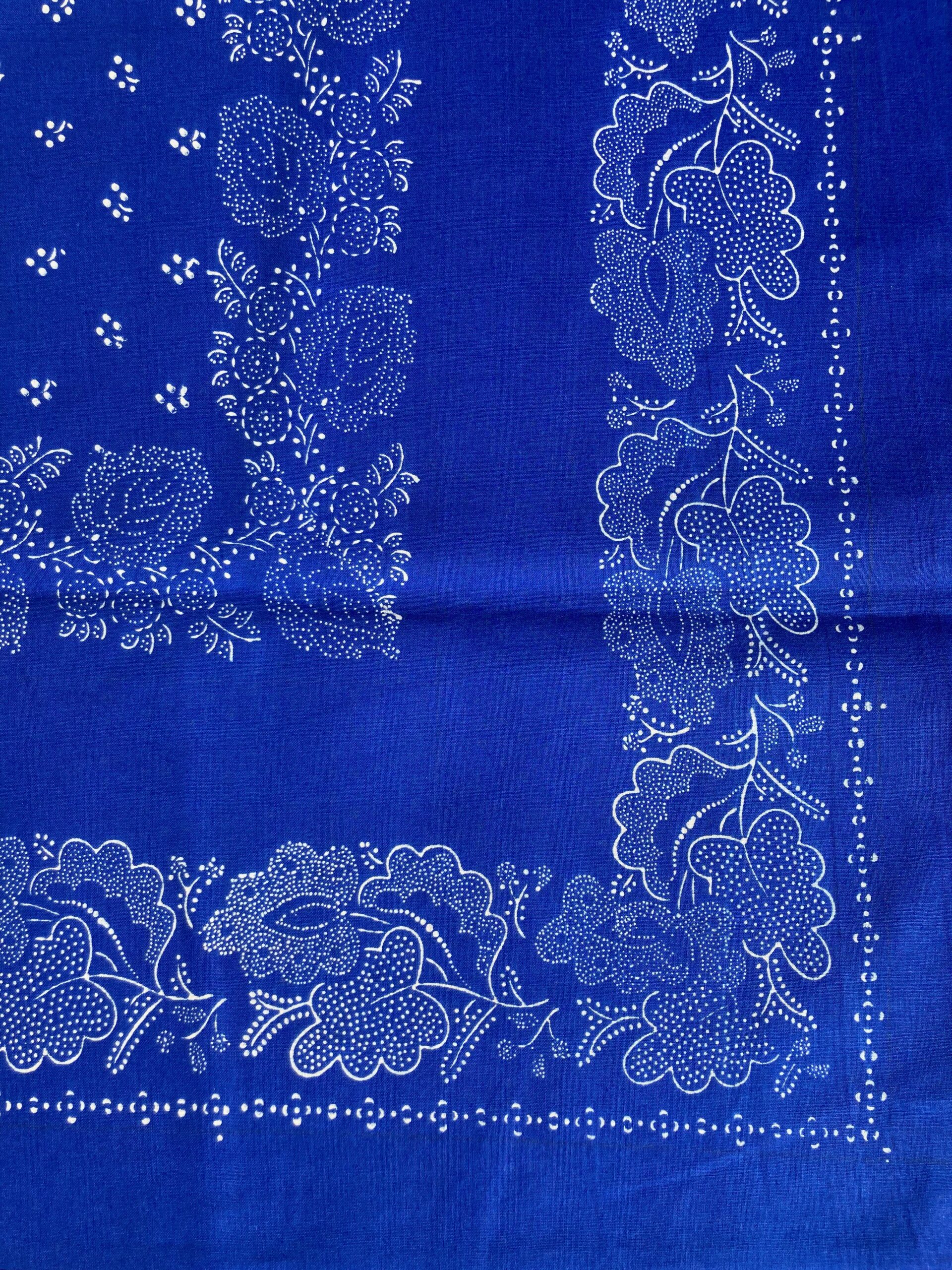 Blaudruck – Mitteldecke mit doppelter Bordüre, ca. 21 cm breit. In der Mitte mit einem Blütenmuster bedruckt. Schöner mittlerer, eher hellerer Blauton.