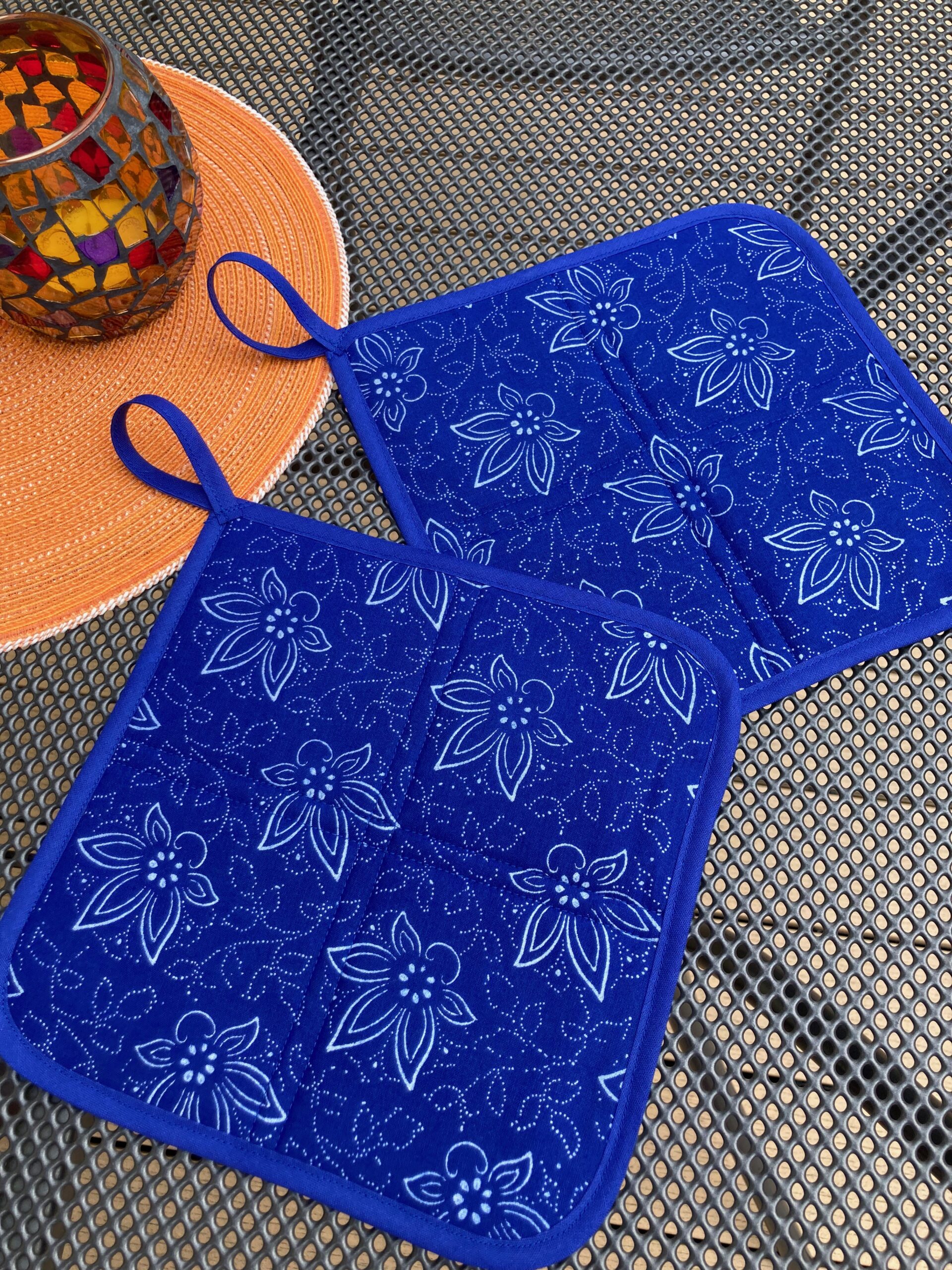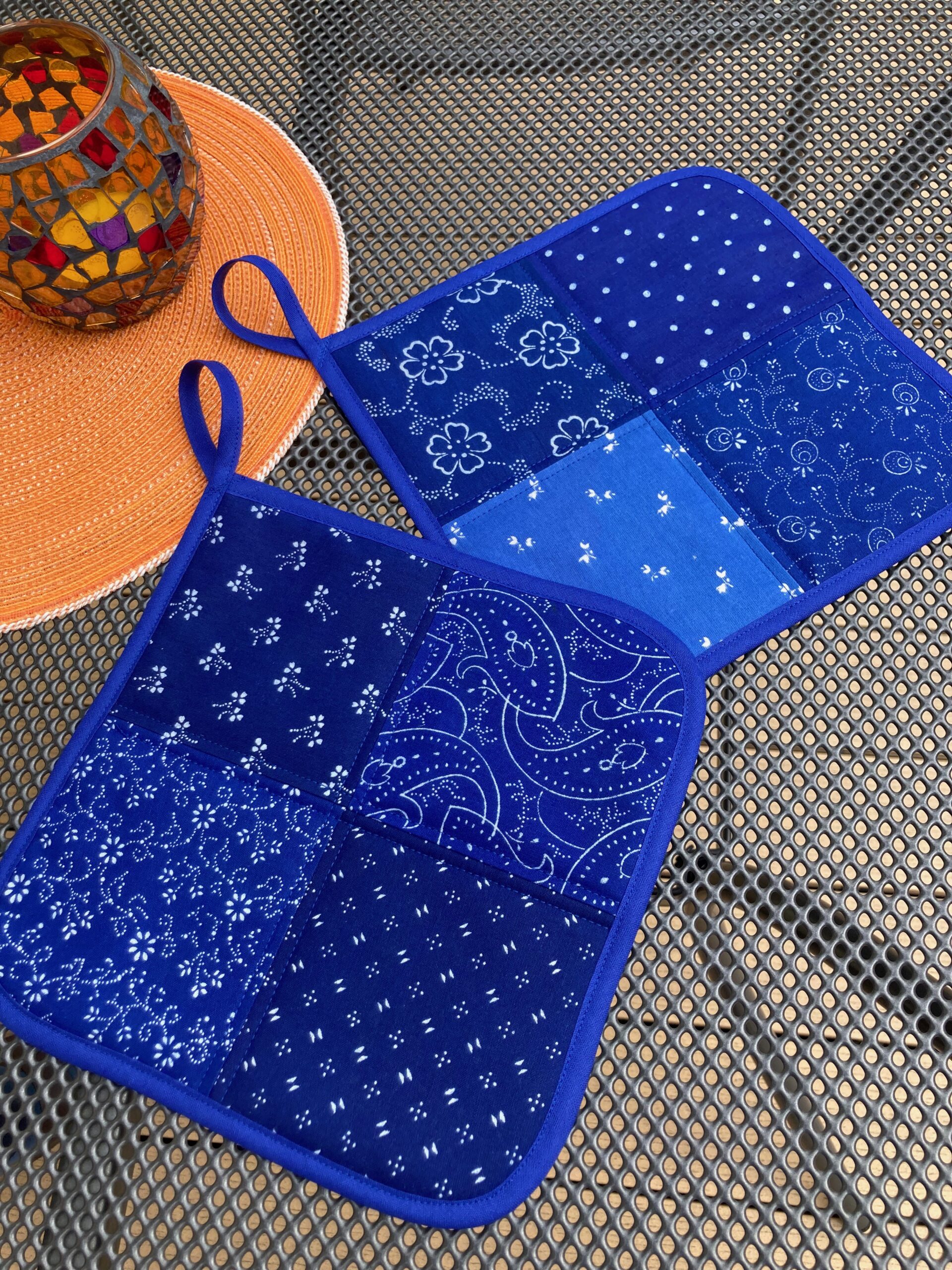 Blaudruck – Topflappen, in Handarbeit gefertigt. Größe der Topflappen ca, 23 x 23 cm. Genäht aus 8 verschiedenen Blaudruckstoffen. Die Rückseite ist auch aus Blaudruck, siehe Foto. Eingefasst sind die Topflappen mit einem farblich passenden Schrägband, oben befindet sich ein großer Aufhänger. Gefüttert sind die Topflappen mit Vlies von Freudenberg, Thermolam.
