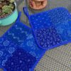 Blaudruck – Topflappen, in Handarbeit gefertigt. Größe der Topflappen ca, 23 x 23 cm. Genäht aus 8 verschiedenen Blaudruckstoffen. Die Rückseite ist auch aus Blaudruck, siehe Foto. Eingefasst sind die Topflappen mit einem farblich passenden Schrägband, oben befindet sich ein großer Aufhänger. Gefüttert sind die Topflappen mit Vlies von Freudenberg, Thermolam.