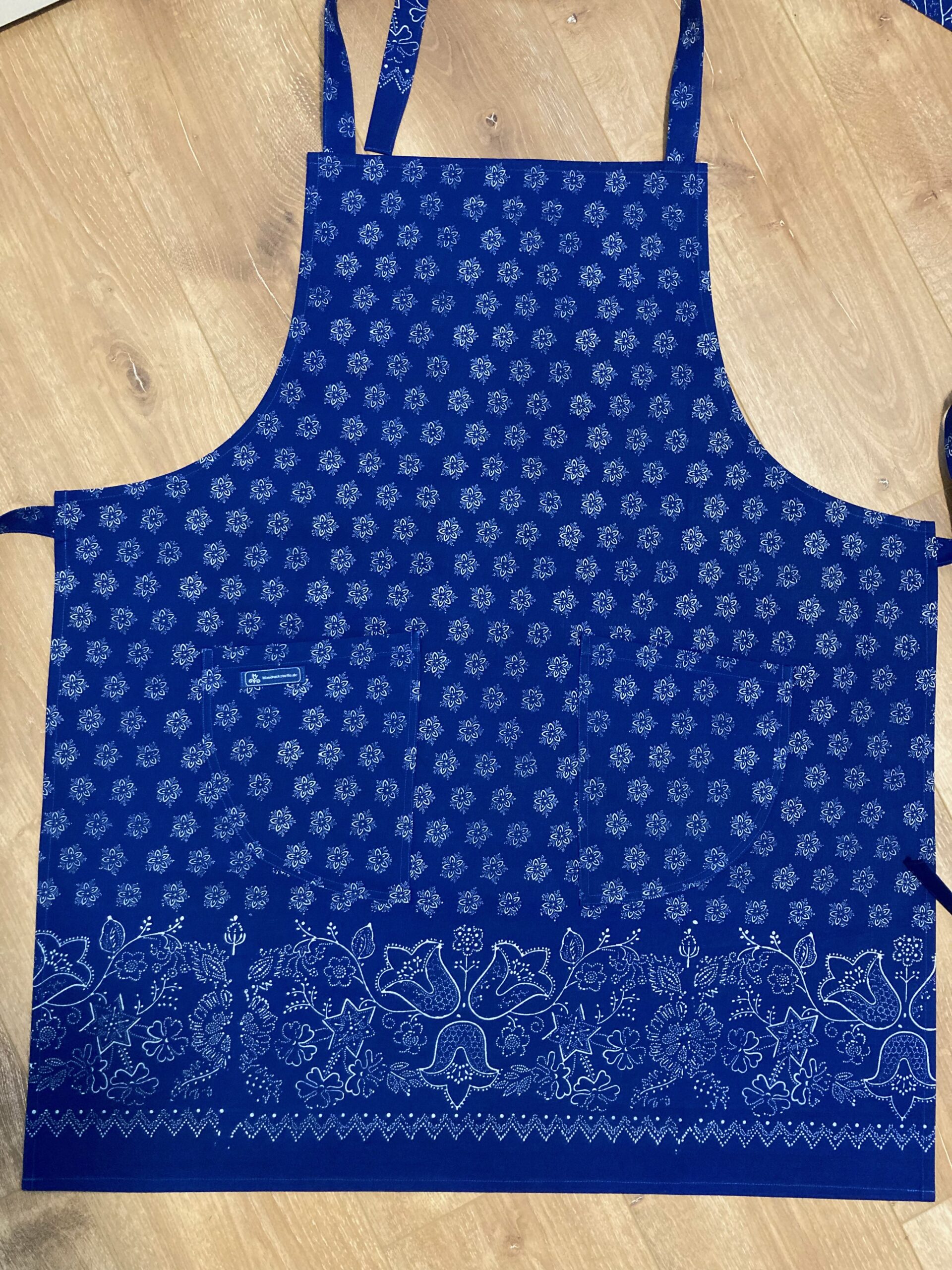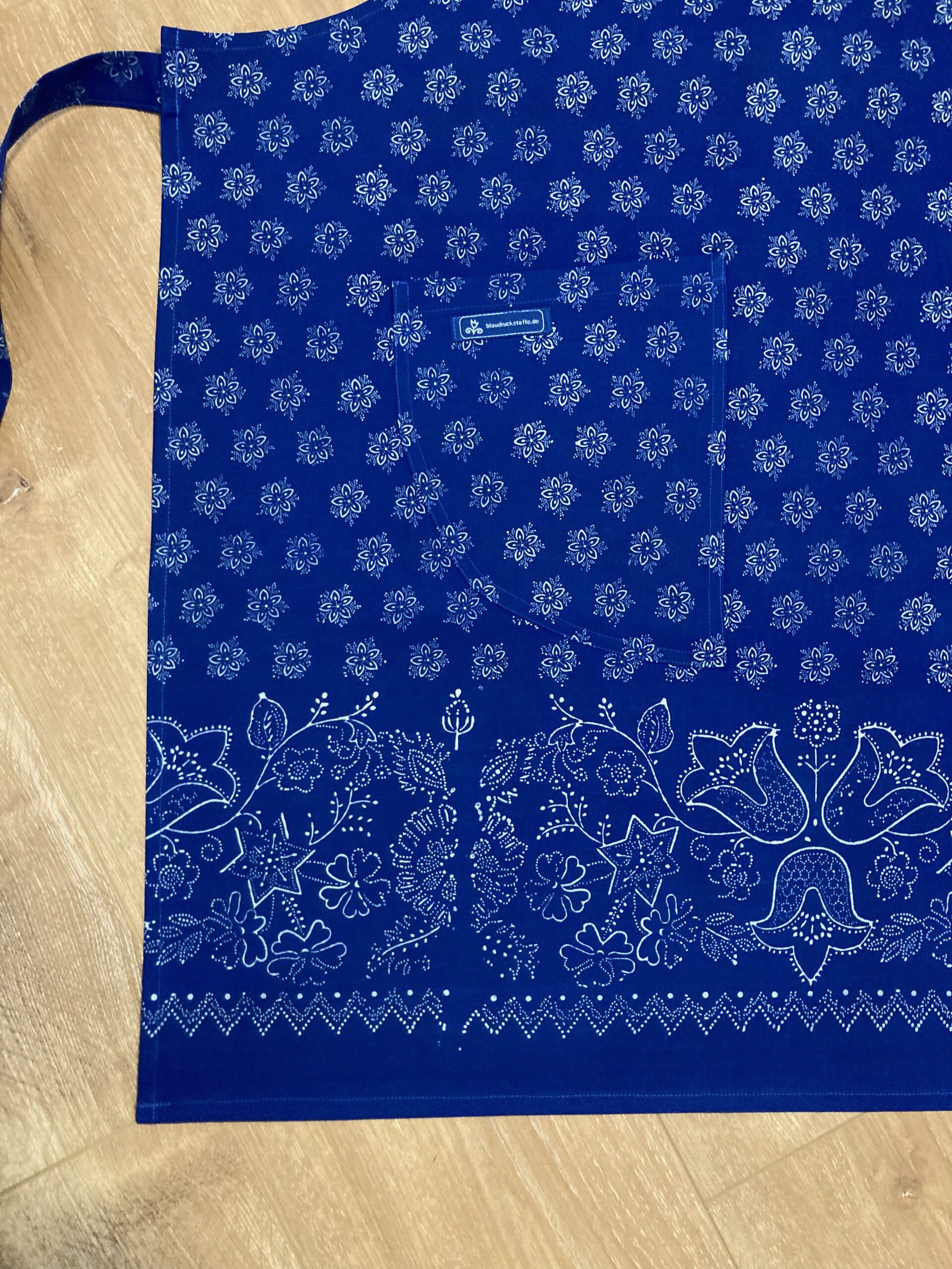 Blaudruckschürze genäht im einfachen Schnitt, somit für Damen und Herren gleichermaßen tragbar. Die Schürzen haben zwei Taschen und sind mit Bändern (je 84 cm) zu binden. Die Schürze ist aus Blaudruckstoff – Bordürenstoff genäht. Oben ist ein flächiges Blumenmuster und eine Bordüre unten. Der Stoff ist eher ein schönes mittleres blau. Die Gesamtlänge beträgt ca. 83 cm und die Breite ca. 71 cm.