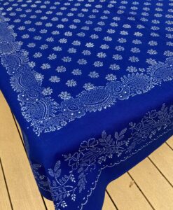 Große Tischdecke mit doppelter Bordüre. Breite der Bordüren ca. 24 cm. Im Mittelmotiv ist die Decke mit einem größeren Blütenmuster, ca. 2,5cm, bedruckt. Schöner leicht dunklerer Blauton. Die Decke ist rundherum gesäumt.