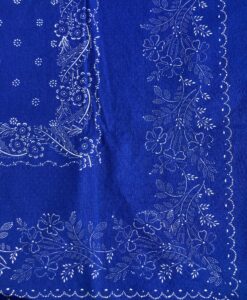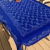 Große Tischdecke mit doppelter Bordüre. Breite der Bordüren ca. 24 cm. In der Mitte ist die Decke mit einem kleinen Blütenmuster bedruckt. Schöner mittlerer Blauton. Die Decke ist rundherum gesäumt.