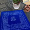 Große runde Tischdecke mit doppelter Bordüre aus Einzelmotiven. Die Bordüre ist ca. 26 cm breit. Im Mittelmotiv ist die Decke mit 4 Druckmotiven aus dem Rand und einem Blümchenmuster bedruckt. Schönes mittleres, eher dunkleres Blau.